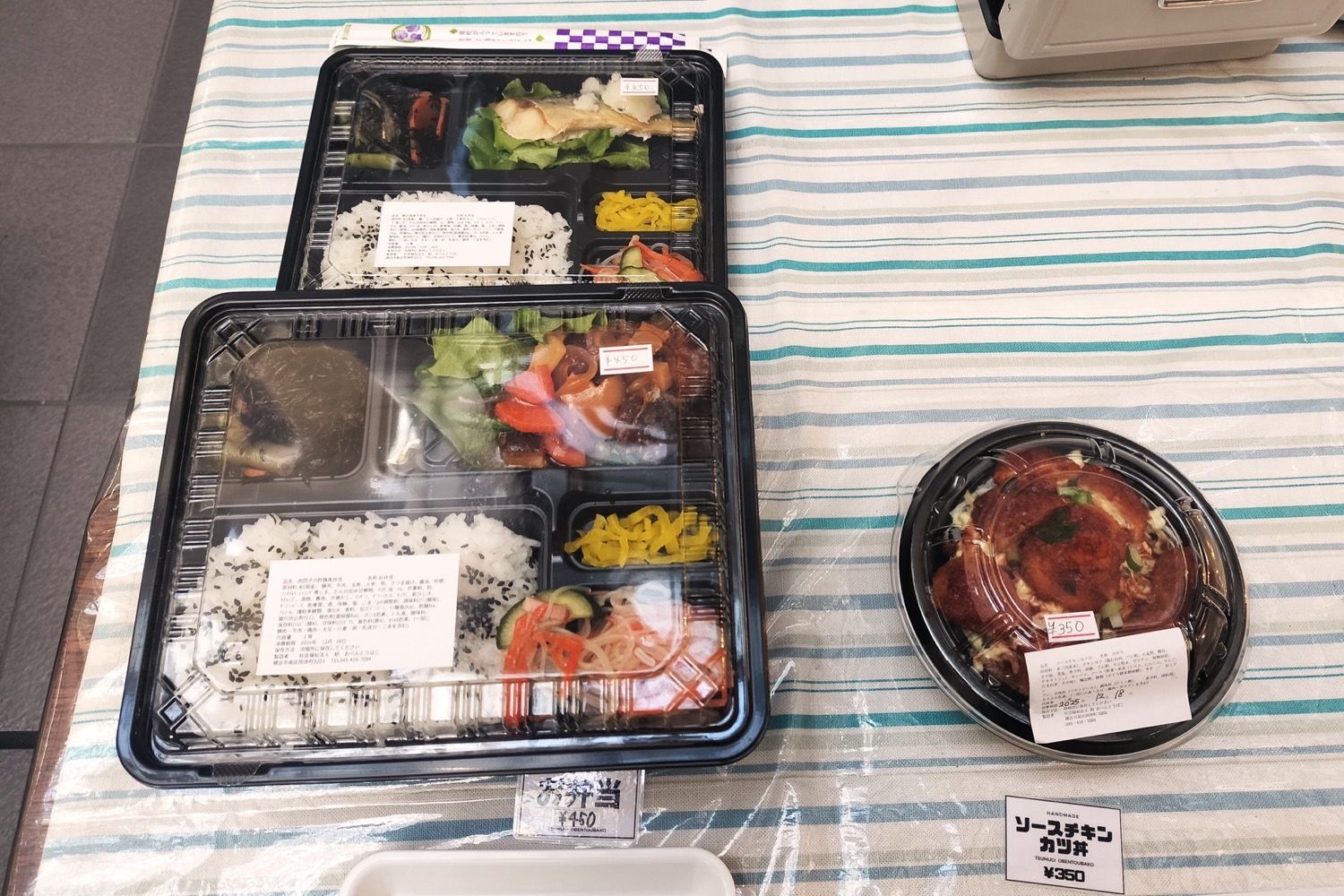 お弁当は450円、丼弁当は350円(税込み価格2025年12月現在)です。この日のお弁当のメインは「肉団子の酢豚風」(手前)と「鯖の塩焼き」(奥)でした。丼は「ソースチキンカツ丼」の他に「中華丼」「麻婆茄子丼」があったそうですが、12時半には売り切れに