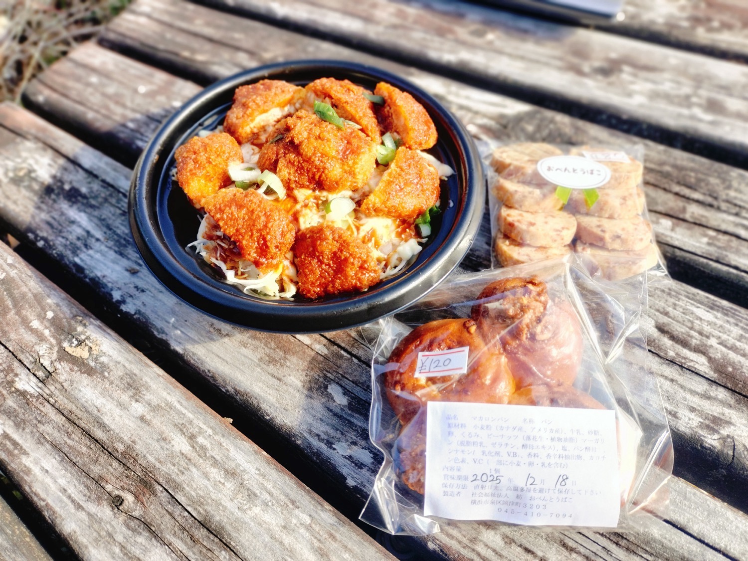 私が購入した「ソースチキンカツ丼」。主役のチキンカツはソースがしっかり染み込んでいて、噛むほどに味が広がる一品でした。見た目も香りも食欲をそそる、満足感のある丼です。「チーズ」というクッキーも購入しました(写真右上)。チーズの風味としょっぱさでワインのお供に良さそうです!