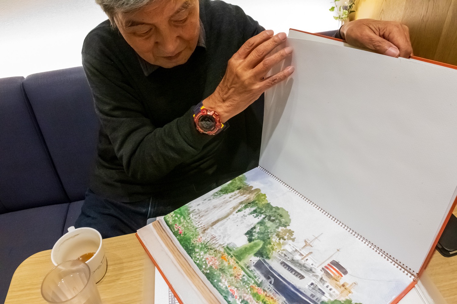 カウンター席の窓越しに見える灰色の空を眺めながら、北條さんはコーヒーを手に取り、「まあ、自然が相手ですからね」と穏やかに微笑みます。屋外でのスケッチを大切にしてきた北條さんにとって、天候は常に向き合う相手のひとつ。それでも「描けない日も、それはそれでいいんです」とやさしく語るその表情には、長年自然と寄り添いながら絵を描いてきた人ならではの落ち着きが感じられました。